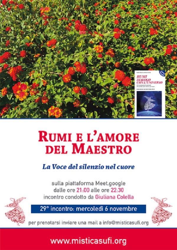 Sede: Mercoledì 22 novembre dalle ore 21.00 alle ore 22.30 sulla piattaforma Meet.google. Ingresso libero. Per partecipare e richiedere il link per il collegamento inviate una e mail a info@misticasufi.org.